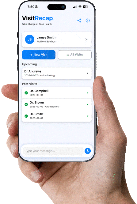 VisitRecap is a patient app that helps you recall, review and retain information from your healthcare appointments. It is does not store or access offical medical records.